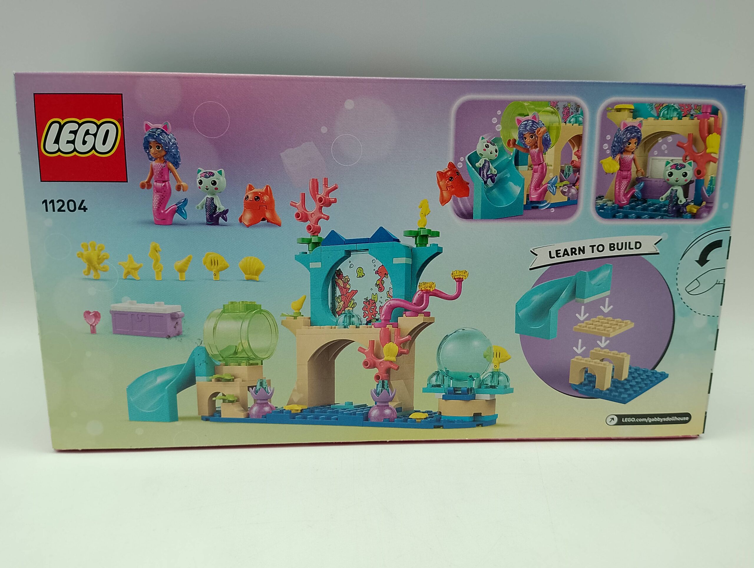 Das detailreiche LEGO® Gabbys Puppenhaus Set steckt voller spannender Funktionen und bekannter Charaktere: Enthalten sind die Spielfigur Gabby im Meerjungfrauenkostüm sowie die niedlichen Figuren Meerkätzchen und Quallen-Kätzchen. Gemeinsam tauchen Kinder in eine farbenfrohe Unterwasserwelt ein und entdecken Muscheln, Pflanzen und viele weitere Meeresdetails.