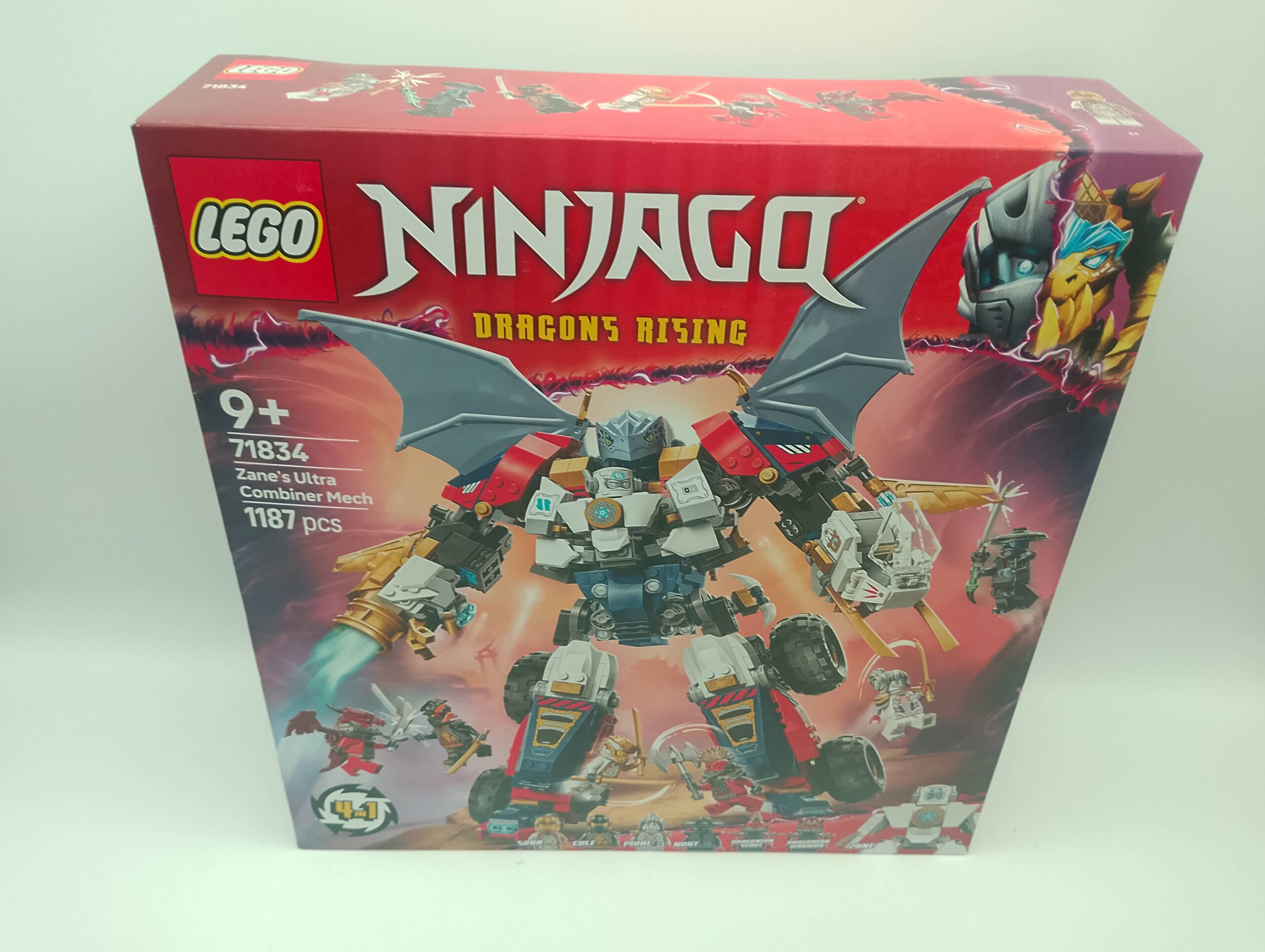 Das Besondere: Der große Mech kann in vier eigenständige Modelle zerlegt werden – einen beweglichen Drachen, einen Jet mit verstellbaren Triebwerken und drehbarem Cockpit, ein geländegängiges Auto mit großen Reifen und zwei aufklappbaren Cockpits (inklusive versteckter Blaster) sowie eine separate Zane-Actionfigur. So entstehen immer neue Spielszenarien voller Spannung.
