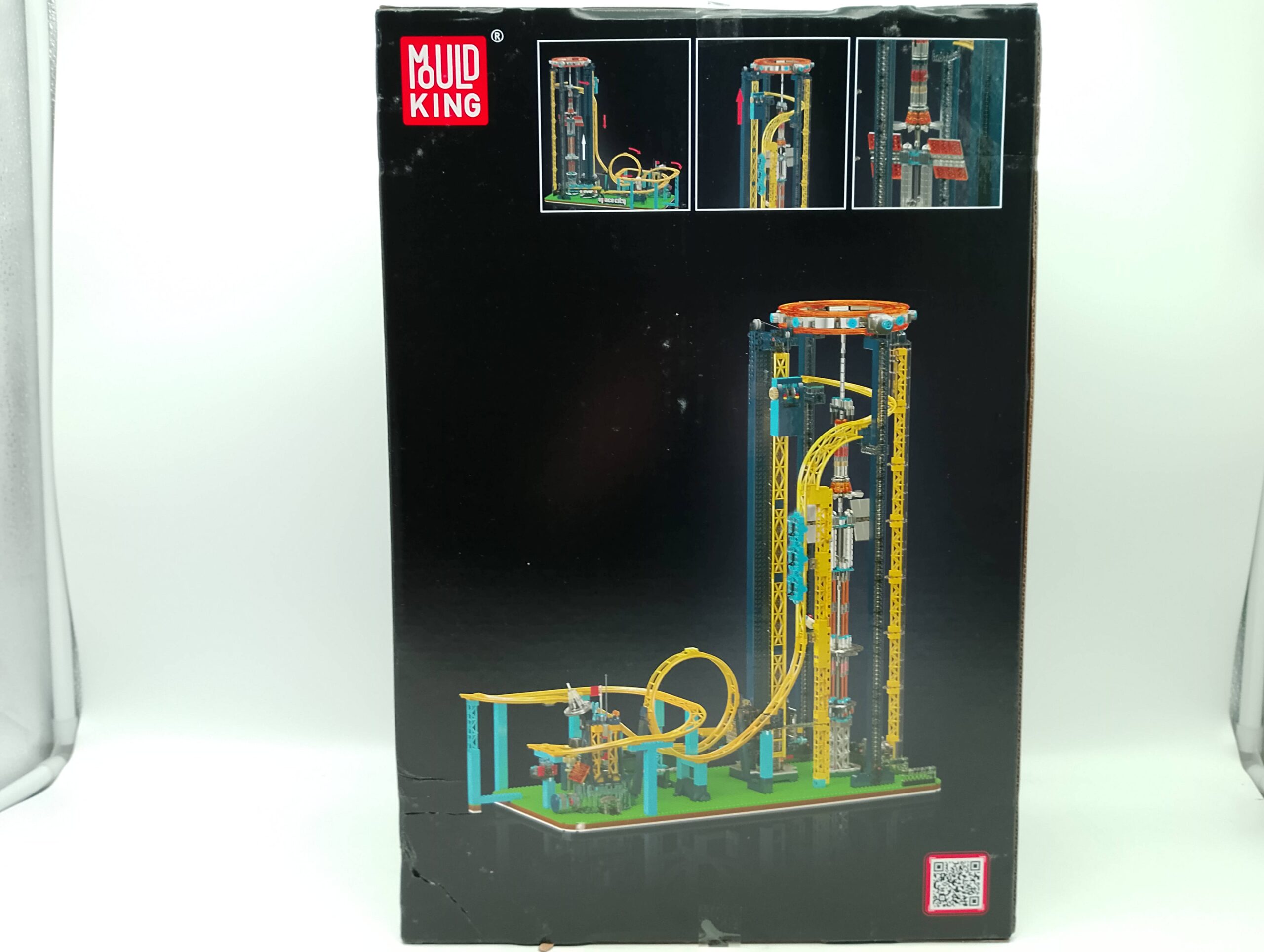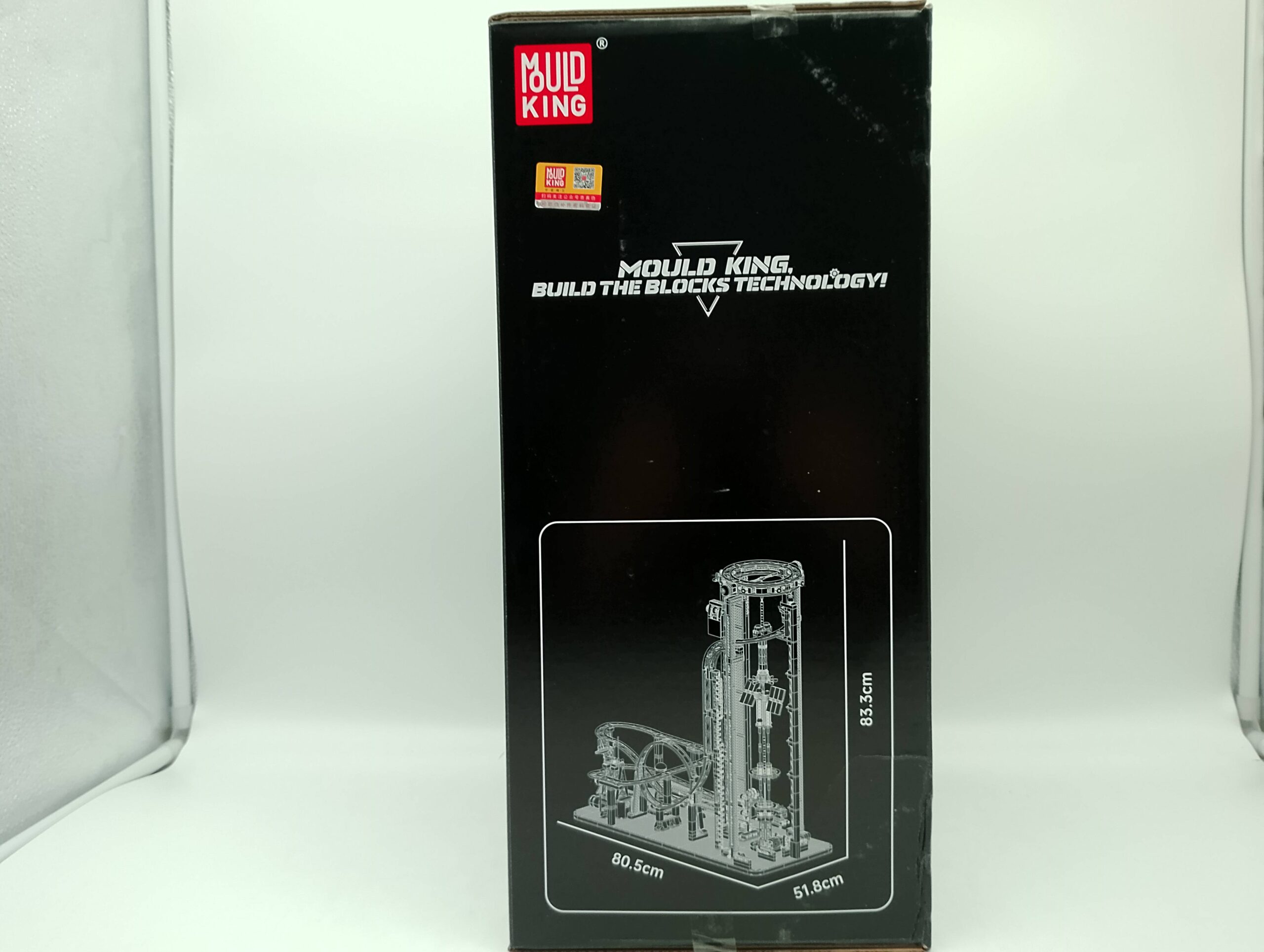 Mit einer Höhe von über 80 cm zieht das fertig montierte Modell sofort alle Blicke auf sich. Leuchtend gelbe Gleise, tiefblaue Strukturen und durchscheinende orangefarbene Ringe verleihen dem Aufzug ein kühnes, futuristisches Farbschema, inspiriert von Themenparks der Zukunft.
